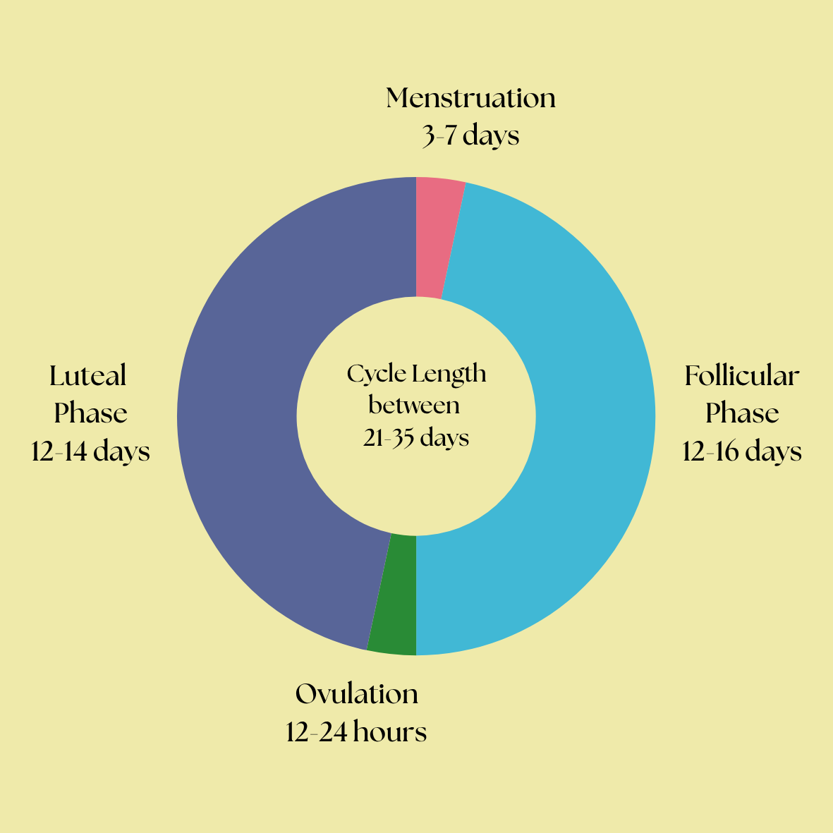The following visual gives the time-frame ranges for each phase of the cycle. As you can tell, the exact length of a cycle depends on the person.